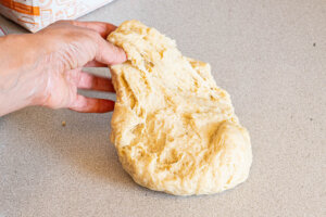 - Saca la masa de la cubeta, colócala en la mesa de trabajo y unifícala. Bolea la masa y déjala reposar 10 minutos. Este descanso hará que se relaje y luego se estire fácilmente.
