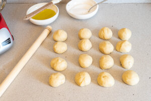 - Forma un rulo, divide en porciones de 50 g y bolea cada una de ellas suavemente.