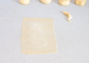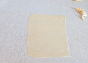 - Con rodillo muy fino (tradicionalmente de madera delgada), estira cada porción hasta 1–2 mm de grosor. Recorta bordes para obtener un cuadrado de ~12×12 cm (orientativo).
