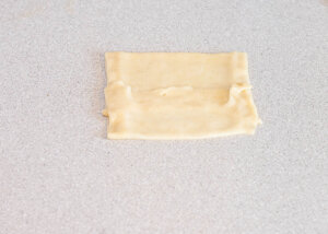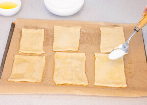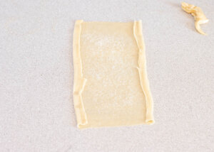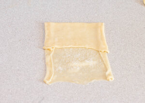 - Espolvorea una capa fina de azúcar en el centro del cuadrado, dejando 2 cm libre en todo el perímetro para que el cierre selle bien.