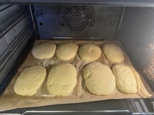 - Vete colocando los molletes a una bandeja con papel de horno, ligeramente separados.