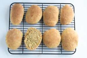 Aún así, la masa que obtendremos es bastante pegajosa, así que la elaboración de los molletes requerirá un pelín de maña. Como contrapartida, por esa falta de gluten apenas será necesario amasar –no más que para integrar los ingredientes– y tampoco tendrás que esperar muchas horas de levado, ni que bolear (resultaría complicado, dada la escasa tensión de la masa, así que bastará con que cortes porciones y les des algo de forma con cuidado).