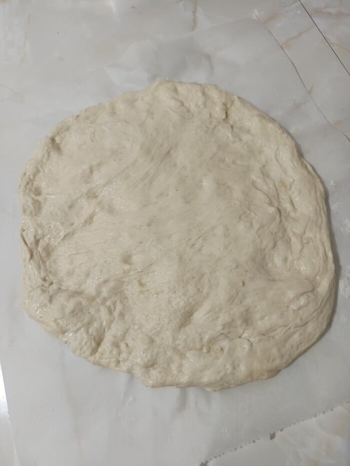 Pasado ese tiempo, nos untamos con aceite las manos, volcamos la masa sobre la mesa y boleamos ligeramente. La ponemos sobre papel vegetal en el que las hornearemos y la aplanamos hasta dejarla con un grosor de aprox. 1 cm. La tapamos con un paño un poco humedecido para que no se pegue, y lo dejamos hasta que doble su volumen (2,5 ó 3 horas).