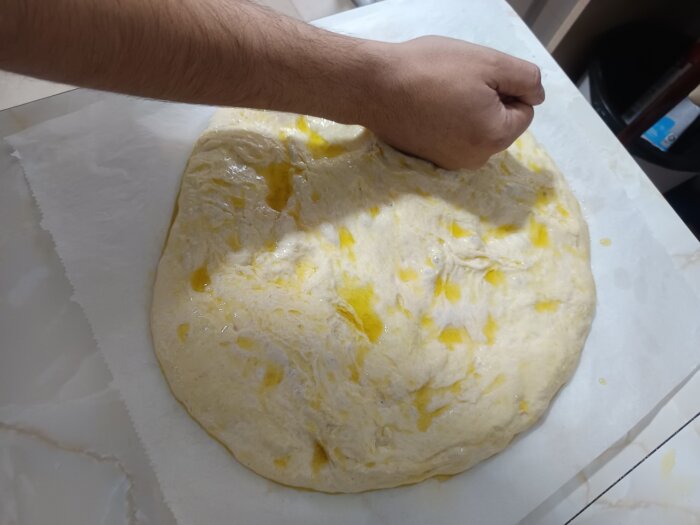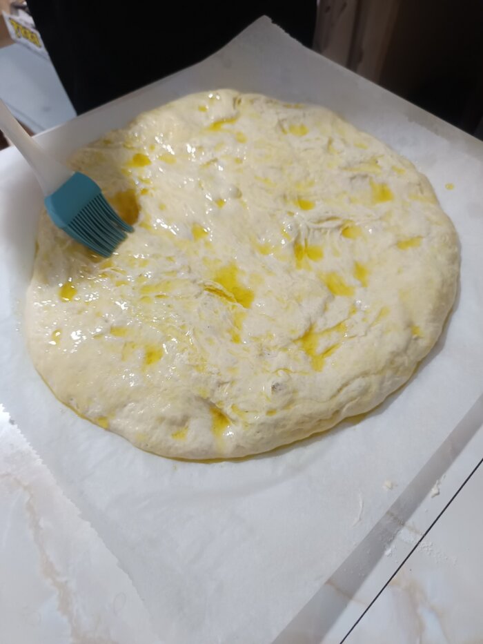 Nos untamos con aceite el lateral de la mano y aplastamos un poco la torta por algunas zonas. También podemos hacer hoyitos con el dedo enaceitado (algunas de las que venden en panaderías los tienen).